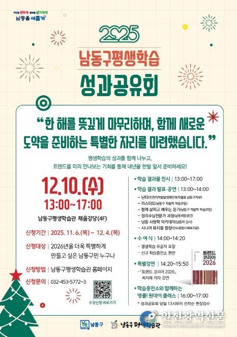 이번 성과공유회는 12월 10일 오후 1시부터 5시까지 남동구 평생학습관 채움강당에서 개최되며, 수강신청은 11월 6일부터 12월 4일까지 평생학습관 홈페이지를 통해 선착순으로 진행된다.