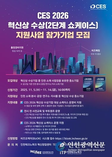 [인천광역신문] 최예준 기자 | 인천테크노파크는 오는 14일까지 CES 2026 혁신상을 수상한 기업들을 대상으로 ‘CES 2026 혁신상 수상(2단계 쇼케이스) 지원사업’의 참가기업을 모집한다.