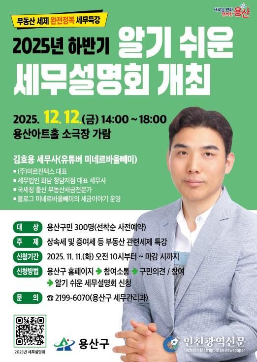 [인천광역신문] 기자 | 서울 용산구가 오는 11일 오전 10시부터 ‘2025 하반기 알기 쉬운 세무설명회’에 참석할 구민 300명을 선착순 사전 모집한다. 이번 설명회는 12월 12일 오후 2~6시 용산아트홀(녹사평대로 150) 소극장 가람에서 열린다.