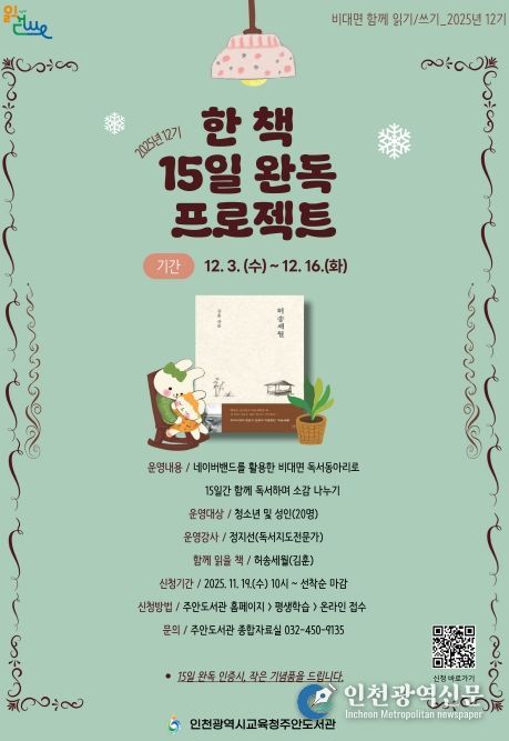 [인천광역신문] 최예준 기자 | 인천광역시교육청주안도서관은 11월 19일 오전 10시부터 ‘12기 비대면 함께 읽기-한 책 15일 완독 프로젝트’ 참여자를 모집한다.