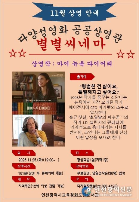 [인천광역신문] 최예준 기자 | 인천광역시교육청화도진도서관은 시민들의 영상문화 향유 기회를 확대하고자 운영 중인 다양성영화 공공상영관 ‘별별씨네마’를 오는 11월 25일 오후 7시, 화도진도서관 평생학습1실에서 진행한다고 밝혔다.