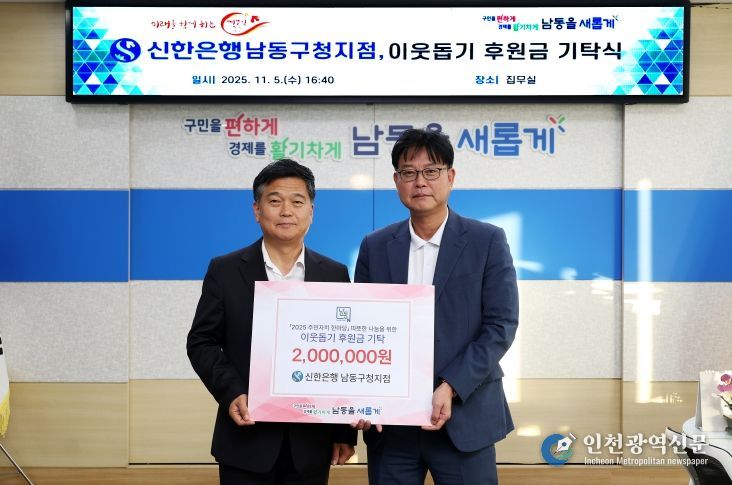 [인천광역신문] 최예준 기자 | 인천시 남동구는 최근 신한은행 남동구청지점이 ‘2025 주민자치 한마당 이웃돕기 후원금’ 200만 원을 기탁했다고 10일 밝혔다.