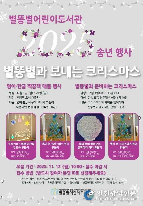 [인천광역신문] 최예준 기자 | 인천광역시 계양구 별똥별어린이도서관이 12월을 맞아 지역주민을 대상으로 ‘별똥별과 보내는 크리스마스'를 운영한다고 밝혔다.