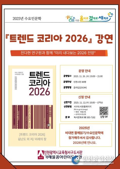 [인천광역신문] 최예준 기자 | 인천광역시교육청서구도서관은 11월 26일 오후 7시부터 9시까지 『트렌드 코리아 2026』의 공동 저자 전다현 연구원을 초청해 ‘미리 내다보는 2026 전망’ 강연을 진행한다.