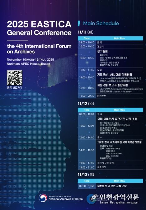 [인천광역신문] 관리자 기자 | 행정안전부 국가기록원은 11월 10일부터 13일까지 부산 누리마루 APEC 하우스에서 '2025년 동아시아기록관리협의회(EASTICA) 정기총회 및 제4회 한국 국가기록원 국제기록관리포럼'을 개최한다고 밝혔다.