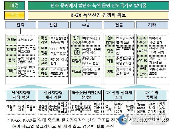 정부는 ‘2035 국가 온실가스 감축목표’ 수립의 후속 조치로 태양광, 풍력, 전력망, 에너지저장장치(ESS), 전기차, 배터리, 히트펌프 등 녹색산업 육성을 위한 세부 추진과제를 담은 ‘대한민국 녹색전환(K-GX, Green Transformation)’을 관계부처, 산업계 등과 함께 내년 상반기까지 수립할 예정이다.