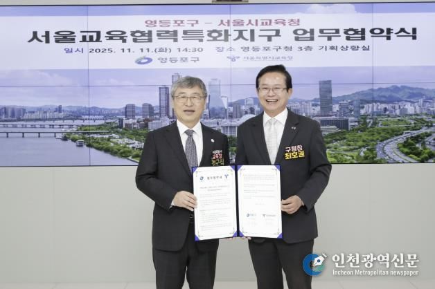 [인천광역신문] 기자 | 영등포구가 지난 11월 11일 서울시교육청과 ‘영등포 교육협력 특화지구’ 및 ‘스쿨매니저 시범 사업’ 추진을 위한 업무협약(MOU)을 체결했다고 밝혔다.