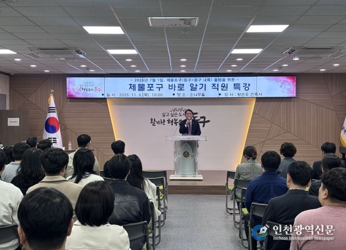 [인천광역신문] 최예준 기자 | 인천 동구는 지난 6일 구청 소나무홀에서 ‘제물포구 바로알기’ 직원 교육 특강을 성황리 마무리했다고 밝혔다. 동구와 중구내륙은 2026년 7월1일 통합돼 제물포구로 출범한다.