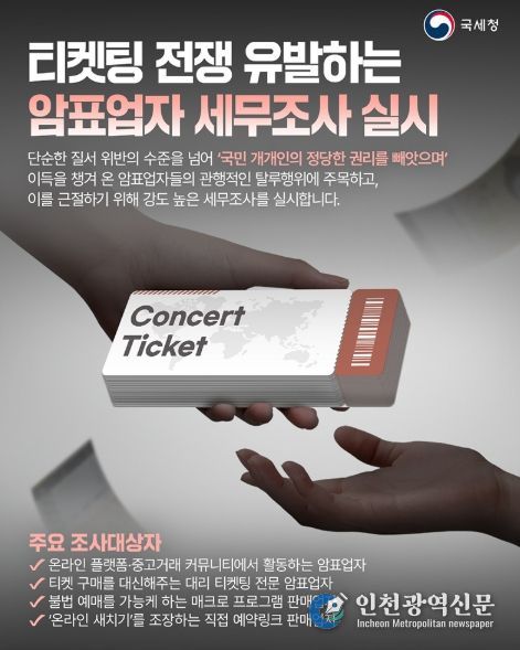 [인천광역신문] 관리자 기자 | 단순한 질서 위반의 수준을 넘어 '국민 개개인의 정당한 권리를 빼앗으며' 이득을 챙겨 온 암표업자들의 관행적인 탈루행위에 주목하고, 이를 근절하기 위해 강도 높은 세무조사를 실시합니다.