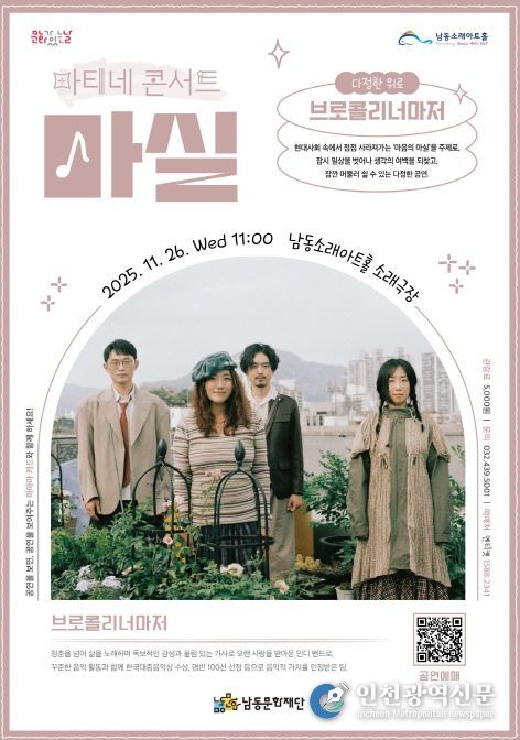 [인천광역신문] 최예준 기자 | 인천시 남동구 남동문화재단은 이달 마지막 수요일인 11월 26일 재단 상설프로그램인 ‘마티네콘서트 마실’의 일환으로 ‘브로콜리너마저’ 콘서트를 개최한다고 12일 밝혔다.