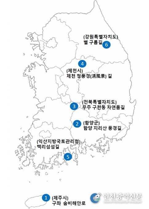 이번에 선정된 관광도로 6곳은 자연경관과 역사문화가 복합적으로 어우러진 “제주(구좌 숨비해안로), 경남(함양 지리산 풍경길), 전북(무주 구천동 자연품길), 충북(제천 청풍경길), 전남(백리섬섬길), 강원(별 구름길) 등 6개 노선으로,
