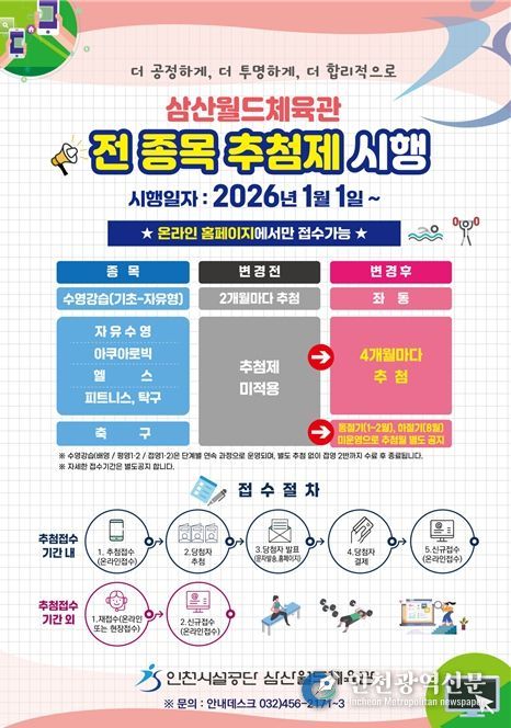 [인천광역신문] 최예준 기자 | 인천시설공단은 내년 1월부터 삼산월드체육관, 계산국민체육센터와 송림체육관 스포츠센터 회원의 수영, 헬스 및 생활체육 등 모든 프로그램의 접수 방식을 기존 선착순제에서 추첨제로 변경하여 운영한다.