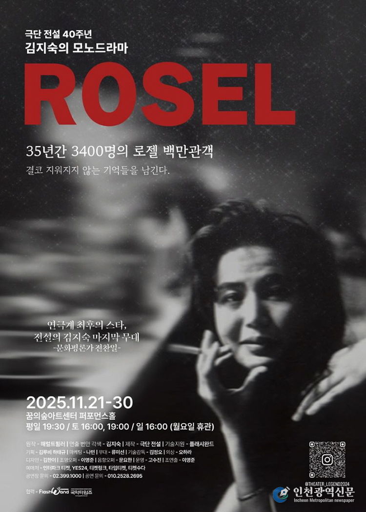 [인천광역신문] 관리자 기자 | 극단 전설 40주년 기념작이자 배우 김지숙의 마지막 공연인 모노드라마 〈로젤〉이 오는 11월 21일부터 30일까지 꿈의숲아트센터 퍼포먼스홀에서 막을 올린다. 35년간 3,400회 이상 공연되며 백만 명이 넘는 관객을 울린 이 작품은 여성의 주체성과 인간성의 회복을 그린 한국 연극사의 대표작으로 꼽힌다.