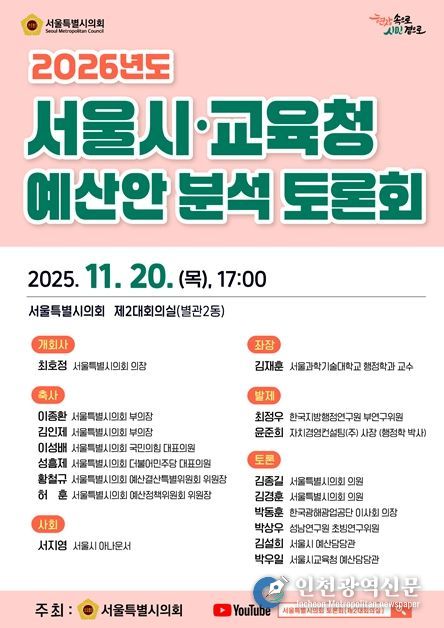 [인천광역신문] 관리자 기자 | 서울특별시의회는 2025년 11월 20일 오후 5시, 서울특별시의회 제2대회의실에서 '2026년도 서울시·교육청 예산안 분석 토론회'를 개최한다.