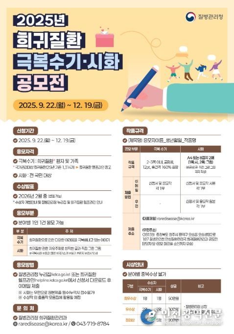 [인천광역신문] 관리자 기자 | 질병관리청은 희귀질환에 대한 사회적 인식 제고와 공감대 형성을 위해 진행 중인 '2025년 희귀질환 극복수기·시화 공모전'의 응모기간을 4주 연장하고, 올해 신설한 시화 부분의 응모자격을 기존 ‘희귀질환 환자 및 가족’에서 ‘전 국민’으로 확대한다고 밝혔다.