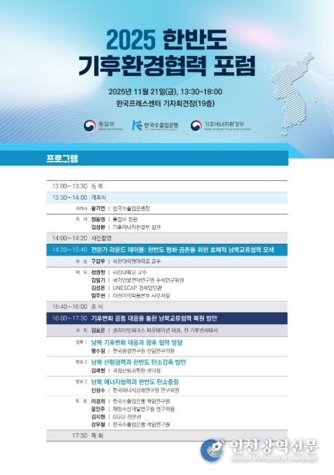[인천광역신문] 관리자 기자 | 통일부는 11월 21일 오후, ‘한국프레스센터’(서울시 중구 소재)에서 '2025 한반도 기후환경협력 토론회'를 개최한다.