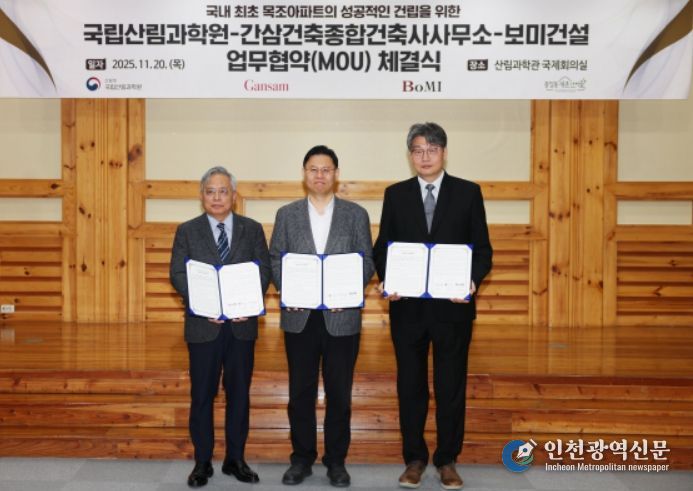 [인천광역신문] 관리자 기자 | 산림청 국립산림과학원은 20일, 간삼건축종합건축사사무소, 보미건설과 함께 국내 최초 목조아파트 건립을 위한 업무협약을 체결했다고 밝혔다.