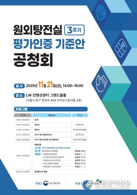 [인천광역신문] 관리자 기자 | 보건복지부가 주최하고 한국한의약진흥원이 주관하는'원외탕전실 3주기 평가인증 기준안 공청회'가 11월 21일 오후 2시에 LW 컨벤션센터 그랜드볼룸에서 개최한다.