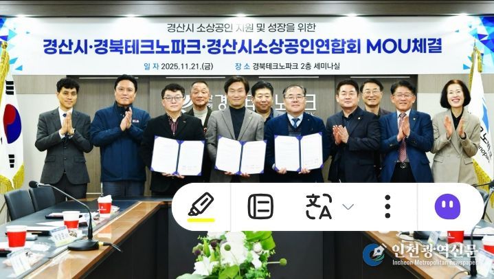 [인천광역신문] 관리자 기자 | 경산시는 21일 경북테크노파크 세미나실에서 경북테크노파크, 경산시소상공인연합회와 함께 ‘소상공인 성장 지원 업무협약(MOU)’을 체결했다고 밝혔다.