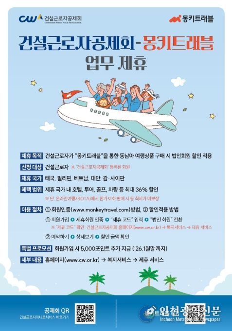 [인천광역신문] 관리자 기자 | 고용노동부 건설근로자공제회는 동남아 자유여행 전문 플랫폼인 몽키트래블과 ‘건설근로자 대상 동남아 자유 여행상품 할인 혜택’을 위한 업무협약을 체결했다고 24일 밝혔다.