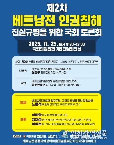 [인천광역신문] 관리자 기자 | 민형배 의원(더불어민주당, 광주 광산을)이 마련한 '제2차 베트남전 인권침해 진실규명을 위한 국회 토론회'가 내일(25일) 오전 9시 30분부터 국회의원회관 제5간담회의실에서 개최된다. 이번 토론회는 베트남전 파병군인 인권침해에 대한 진실규명 문제를 논하는 최초의 공개 토론회이다.