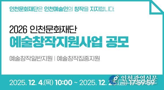 [인천광역신문] 최예준 기자 | 인천문화재단은 오는 12월 2026 예술창작지원사업 공모를 시작한다. 공모 분야는 예술창작일반지원, 예술창작집중지원으로 두 가지이다. 접수기간은 2025년 12월 4일부터 12월 26일까지이며, 국가문화예술지원시스템으로 온라인 신청을 받는다.