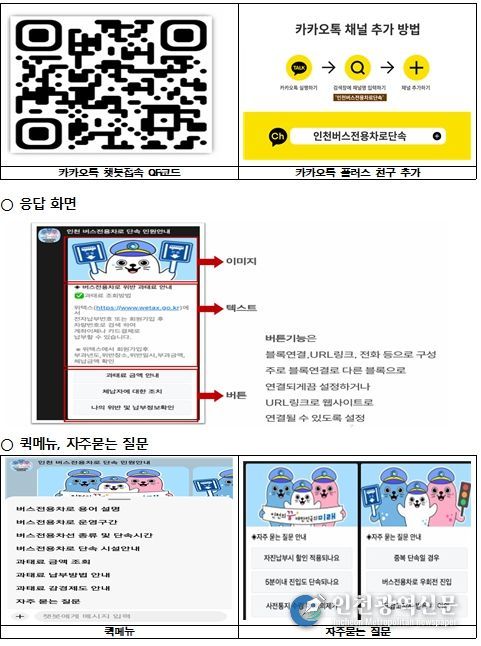 [인천광역신문] 최예준 기자 | 인천광역시는 오는 12월 1일부터 카카오톡을 기반으로 하는 24시간 ‘버스전용차로 단속 민원상담 챗봇 서비스’를 운영한다고 밝혔다.