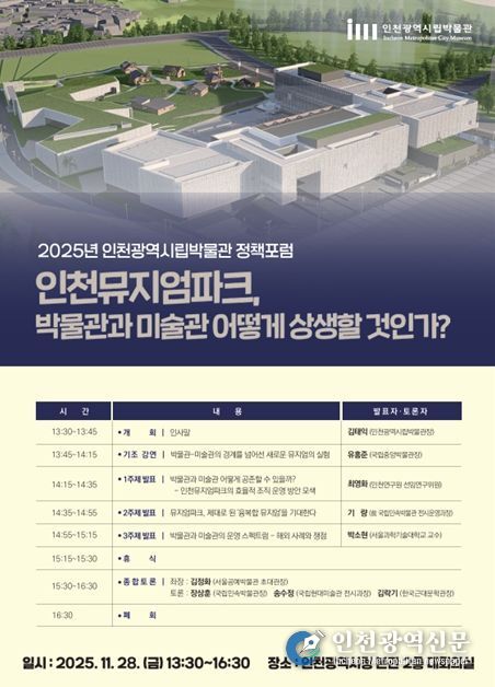 [인천광역신문] 최예준 기자 | 인천광역시 시립박물관은 오는 11월 28일 인천시청 대회의실에서 ‘인천뮤지엄파크, 박물관과 미술관 어떻게 상생할 것인가?’를 주제로 정책 포럼을 개최한다고 밝혔다.
