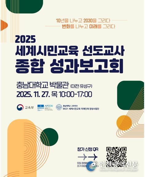 [인천광역신문] 관리자 기자 | 교육부는 유네스코아시아태평양국제이해교육원(원장 임현묵)과 함께 11월 27일 충남대학교 박물관에서 2025년 세계시민교육 선도교사 종합 성과보고회를 개최한다.