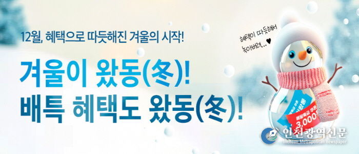 [인천광역신문] 관리자 기자 | 경기도와 경기도주식회사가 공동 운영하는 경기도 공공배달앱 배달특급이 겨울을 맞아 12월 한 달간 ‘겨울이왔동(冬)’ 소비자 할인 프로모션을 진행한다.