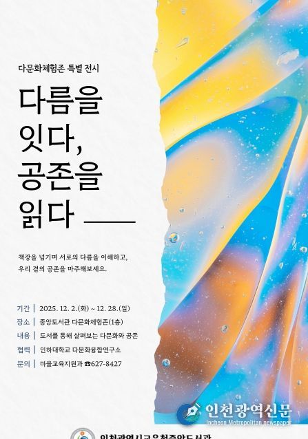 [인천광역신문] 최예준 기자 | 인천광역시교육청중앙도서관은 12월 2일부터 28일까지 1층 다문화체험존에서 다문화 특별 전시 ‘다름을 잇다, 공존을 읽다’를 진행한다.