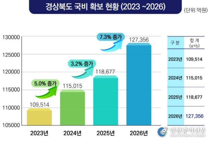[인천광역신문] 관리자 기자 | 경상북도는 12월 2일 국회 본회의를 통과한 2026년도 국가예산에서 총 12조 7,356억원을 확보하며 역대 최고 성과를 달성했다고 밝혔다. 이는 새 정부 출범으로 정책 환경이 급변한 상황에서도 선제적이고 체계적인 대응을 펼친 데 따른 것으로, 그 결과 전년도 11조 8,677억원 대비 8,679억원(약 7.3%) 증가한 실적을 기록했다. 이처럼 경북도의 대응 전략이 효과를 발휘한 데에는 예결위원 및 간사를 비롯한 지역 국회의원과의 긴밀한 공조, 그리고 연초부터 경상북도가 일관되게 추진해온‘전방위 총력 대응’전략이 결실을 맺은 것으로 그 의미가 더욱 크다.