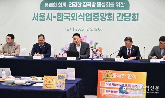 [인천광역신문] 기자 | 오세훈 서울시장은 3일 오후 12시, 서울시청 간담회장에서 (사)한국외식업중앙회(서울시협의회) 지회장들을 만나, 외식이나 배달시에도 흰쌀밥 대신 통곡물 잡곡밥을 선택할 수 있는 ‘통쾌한 한끼’ 참여 음식점 확대를 위한 협력 방안을 모색했다.