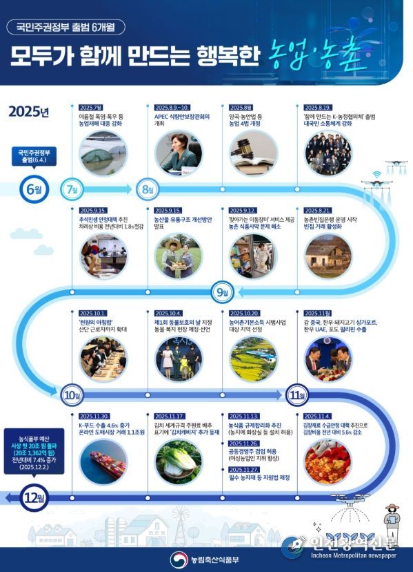 [인천광역신문] 관리자 기자 | 농림축산식품부는 새 정부 출범 후 약 6개월동안 정책의 연속성과 과감한 혁신 기조 하에서 현장에서 체감할 수 있는 변화를 이끌어 내는 동시에, 만성적 쌀 공급 과잉, 농촌 고령화 등 농업·농촌의 구조적 문제 해결과 희망을 실현하는 농업·농촌을 만들기 위해 전력을 다하고 있다.