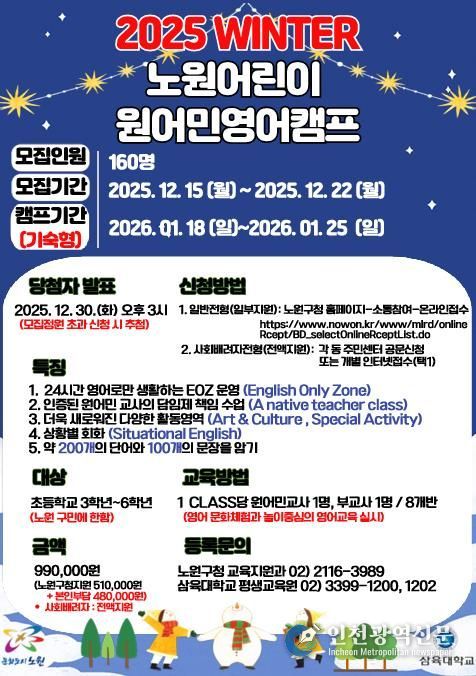 캠프는 오는 1월 18일부터 1월 25일까지 7박 8일 일정으로 삼육대학교에서 진행된다. 참가 대상은 노원구에 거주하는 초등학교 3~6학년으로, 총 160명을 모집해 20명씩 8개 반으로 운영한다. 학생들은 사전 레벨 테스트를 통해 학습 수준에 맞는 반에 배치되며, 반별 수준은 공개하지 않는다.