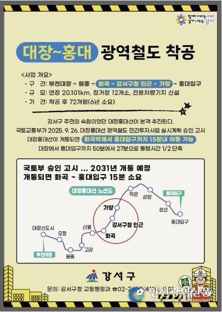 [인천광역신문] 기자 | 서울 강서구의 숙원 사업이자 서남권 교통 체계를 획기적으로 바꿀 광역철도 사업인 ‘대장홍대선’이 12월 15일 공식 착공한다.