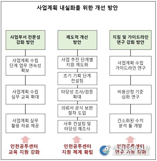 또한, 인천시 사업계획 내실화를 위한 개선방안과 인천공공투자관리센터의 단계별 지원 확대 방안으로, △사업부서의 전문성 강화, △제도적 개선, △지침 및 가이드라인 연구 강화 등을 제시했다.