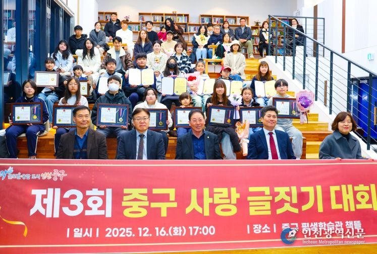 [인천광역신문] 최예준 기자 | 인천 중구의회는 12월 16일, 중구 평생학습관에서 개최된 제3회 중구사랑 글짓기 대회 시상식에 참석해 수상자들을 축하했다고 밝혔다.