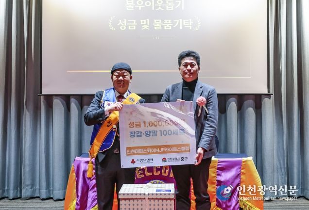 [인천광역신문] 최예준 기자 | 인천시 중구는 지난 12일 ‘인천마린스카이MJF라이온스클럽(회장 장준희)’이 연말연시를 맞아 지역 내 어려운 이웃을 돕기 위해 성금 100만 원과 방한용품(수면 양말, 장갑) 100세트를 기탁했다고 밝혔다.