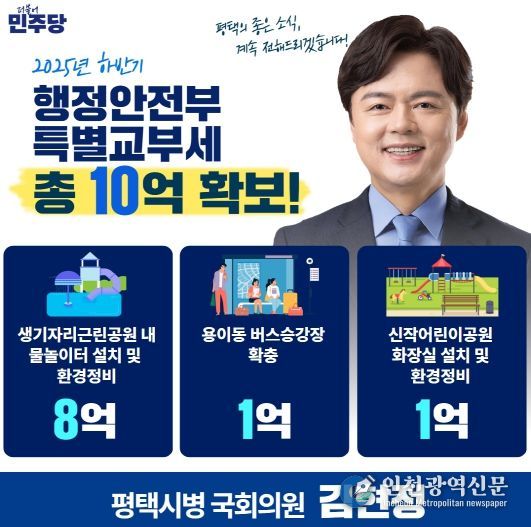[인천광역신문] 관리자 기자 | 김현정 국회의원(평택시병·더불어민주당)은 2025년 하반기 행정안전부 특별교부세 총 10억 원을 확보해, 지역 주민의 생활환경 개선과 안전·편의 증진을 위한 주요 현안 사업을 본격 추진한다고 밝혔다.