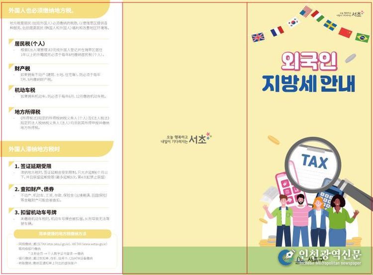 [인천광역신문] 기자 | 서울 서초구는 지역 내 거주하는 외국인 주민들의 지방세 납부 편의를 위해 총 4개 언어로 제작한 ‘외국인 지방세 안내’ 리플렛을 제작해 배부에 나선다고 밝혔다.
