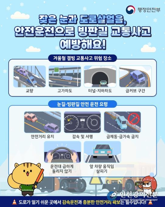 [인천광역신문] 관리자 기자 | 행정안전부는 겨울철에 발생하기 쉬운 빙판길 교통사고에 각별한 주의를 요청했다.