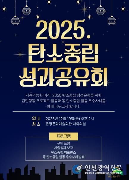 [인천광역신문] 박진 기자 | 서울 은평구는 오는 19일 은평문화예술회관 대회의실에서 ‘2025. 탄소중립 성과공유회’를 개최한다고 밝혔다.
