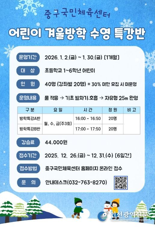 이번 특강반은 2026년 1월 2일부터 1월 30일까지 중구국민체육센터 수영장에서 초등학교 1~6학년 어린이를 대상으로 운영된다.