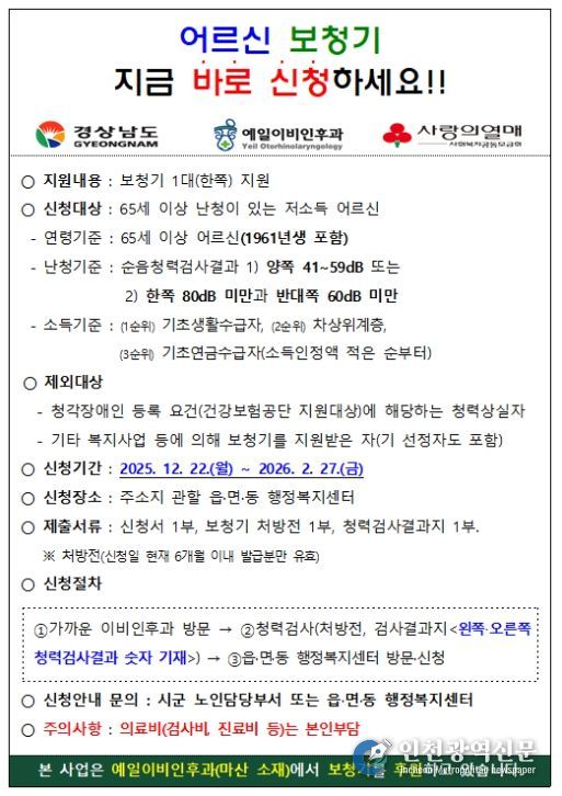 [인천광역신문] 박진 기자 | 경상남도는 난청으로 일상생활에 불편을 겪는 도내 어르신들의 건강한 삶을 지원하기 위해 2026년 '어르신 기부보청기 지원사업'을 대폭 개선해 추진한다고 밝혔다.