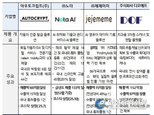 이 외에도 자동차 인증발급 솔루션 기업인 아우토크립트(주), 온디바이스 AI솔루션 기업인 ㈜노타는 지난 7월과 10월 각각 코스닥에 상장했으며, 자율주행 드론 개발 기업인 니어스랩은 25개국 이상과 수출계약을 체결했고, 치과용 3차원 스캐너 및 덴탈플랫폼을 개발하는 주식회사 디오에프는 해외 유통채널을 신규 확보하여 97억원의 수출 실적을 달성했다.