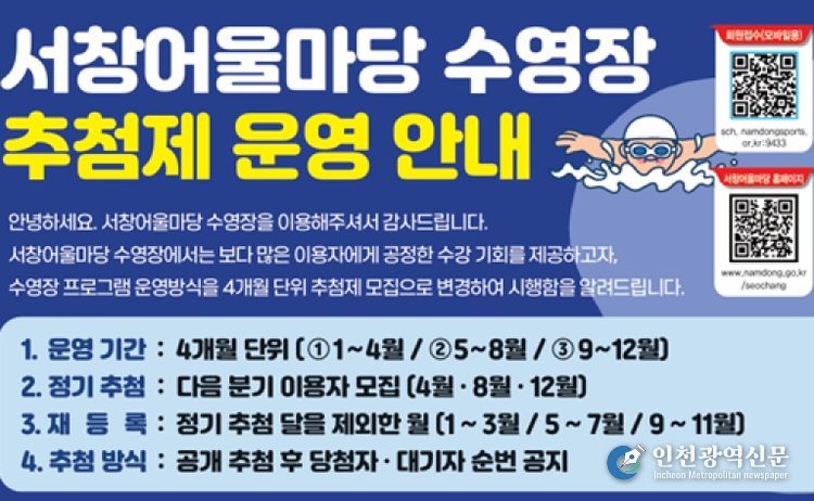 [인천광역신문] 박진 기자 | 인천시 남동구 도시관리공단은 주민들이 공평하게 시설을 이용할 수 있도록 서창어울마당 수영장 운영을 기존 선착순 방식에서 추첨제로 전환한다고 19일 전했다.