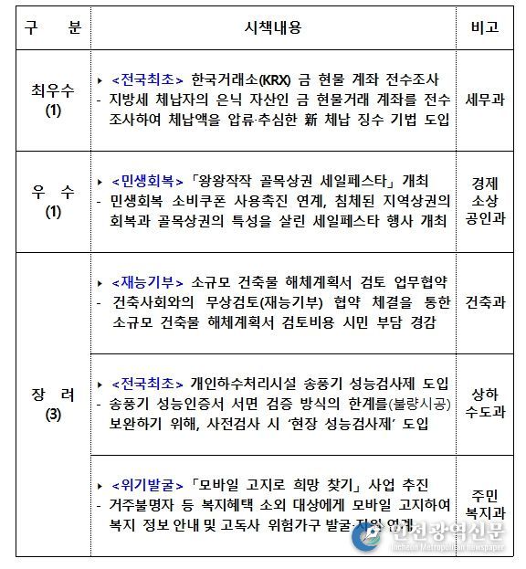 선정된 우수 시책 5건을 구체적으로 살펴보면 ’최우수’ 시책으로는 세무과의 '전국 최초, 한국거래소(KRX) 금 현물 계좌 전수조사'가 선정됐다.