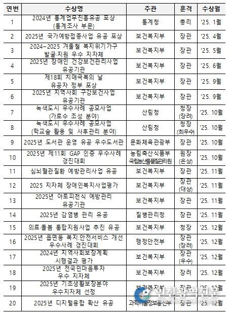 수상 내역을 살펴보면 분야별 ▲ 보건․의료 9건, ▲ 사회복지 5건, ▲ 일반행정 3건, ▲ 환경 2건, ▲ 농업 1건으로, 주민의 삶의 질과 직결되는 보건 복지 분야에서 특히 두드러진 성과를 보였다.