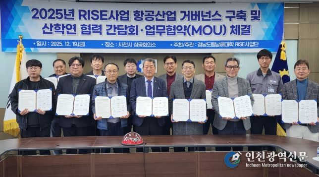 [인천광역신문] 박진 기자 | 경남도립남해대학(총장 노영식)은 19일 오전 10시 30분, 사천시 상공회의소 3층 회의실에서 지역 항공산업의 지속 가능한 성장과 경쟁력 강화를 위해 ‘2025 RISE·글로컬대학사업 성과 확산을 위한 항공산업 지·산·학 협력 거버넌스 구축 및 업무협약(MOU) 체결식’을 개최했다.